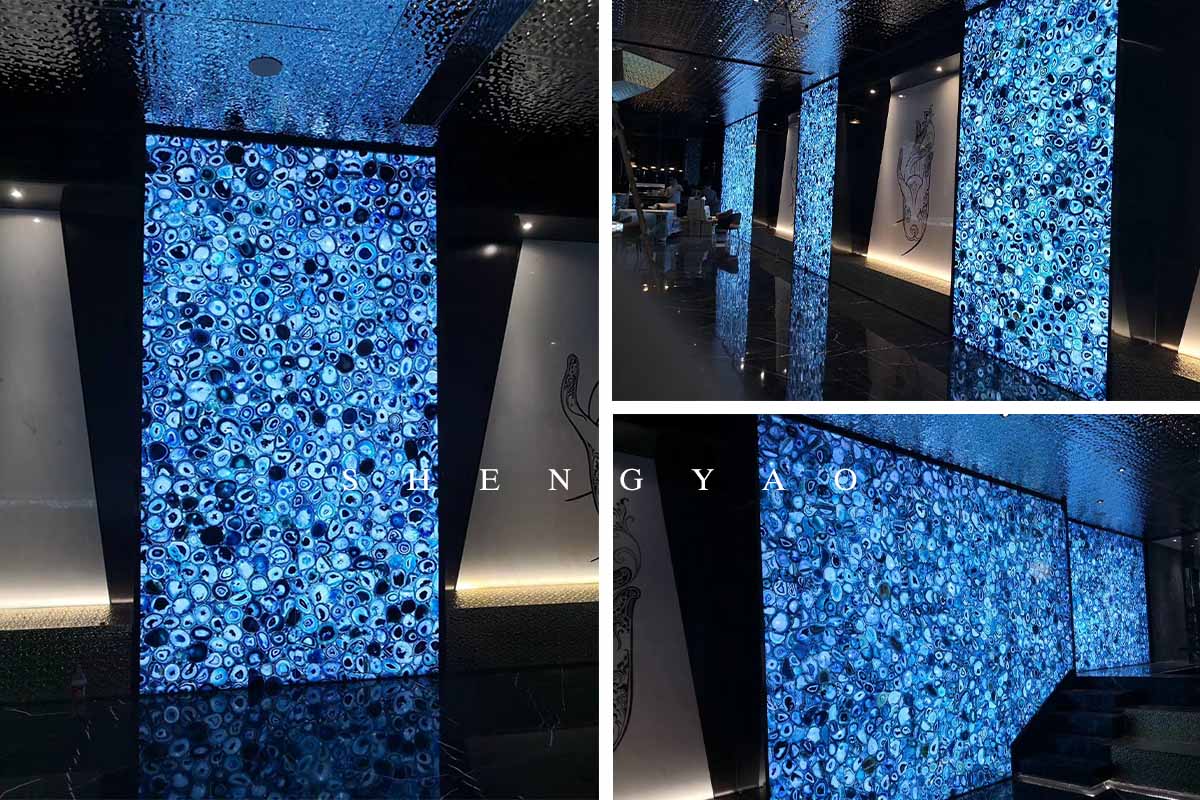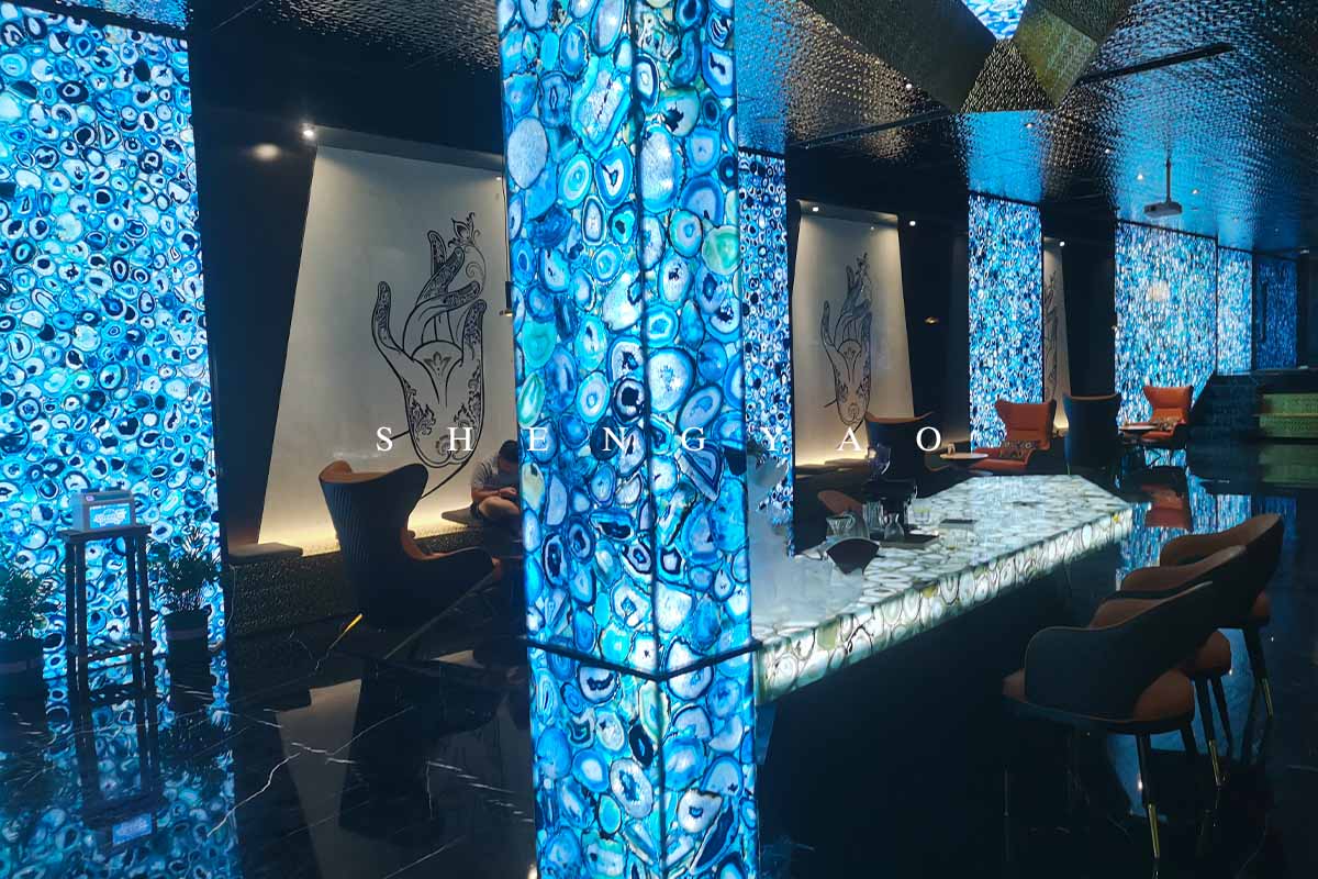 أحجار شبه كريمة طبيعية فاخرة للتجهيزات الداخلية ، أحجار العقيق الزرقاء ذات الإضاءة الخلفية ، وخاصة الأنواع الشفافة التي يمكن أن تضيء من الخلف ، تخلق تأثيرات لونية فريدة وتضيف لمسات أصلية إلى الغرفة. لتعزيز الغرف وجعلها فريدة من نوعها.