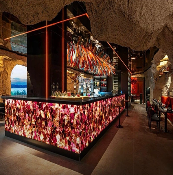 بالنسبة للمطاعم التي تتطلع إلى التميز ورفع صورة علامتها التجارية، يعد البار المصنوع من حجر العقيق ذو الإضاءة الخلفية حلاً تصميميًا قويًا وخالدًا.