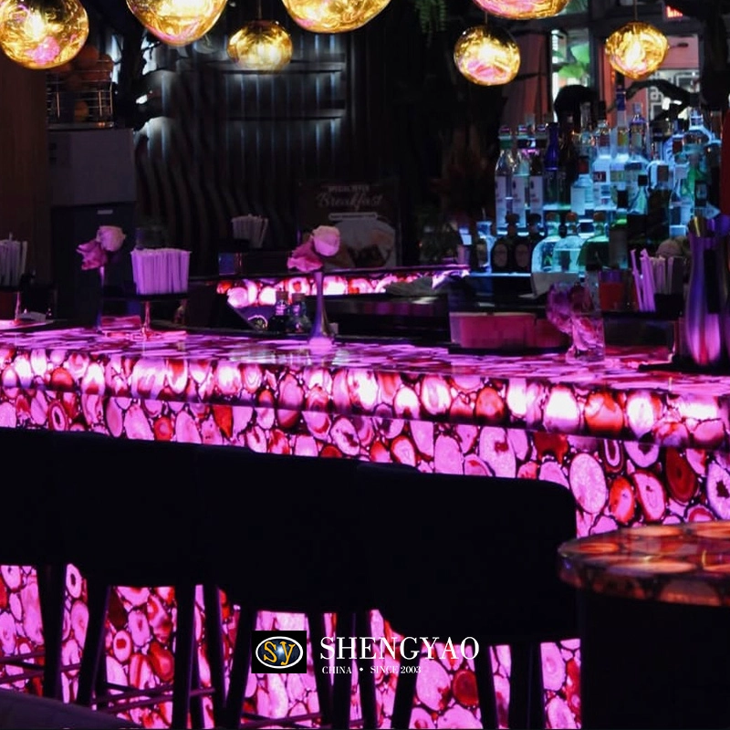 الشفافية الطبيعية للعقيق تجعله مثاليًا لطاولات البار ذات الإضاءة الخلفية، مما ينتج عنه توهجًا ناعمًا ودافئًا يرفع من الأجواء.