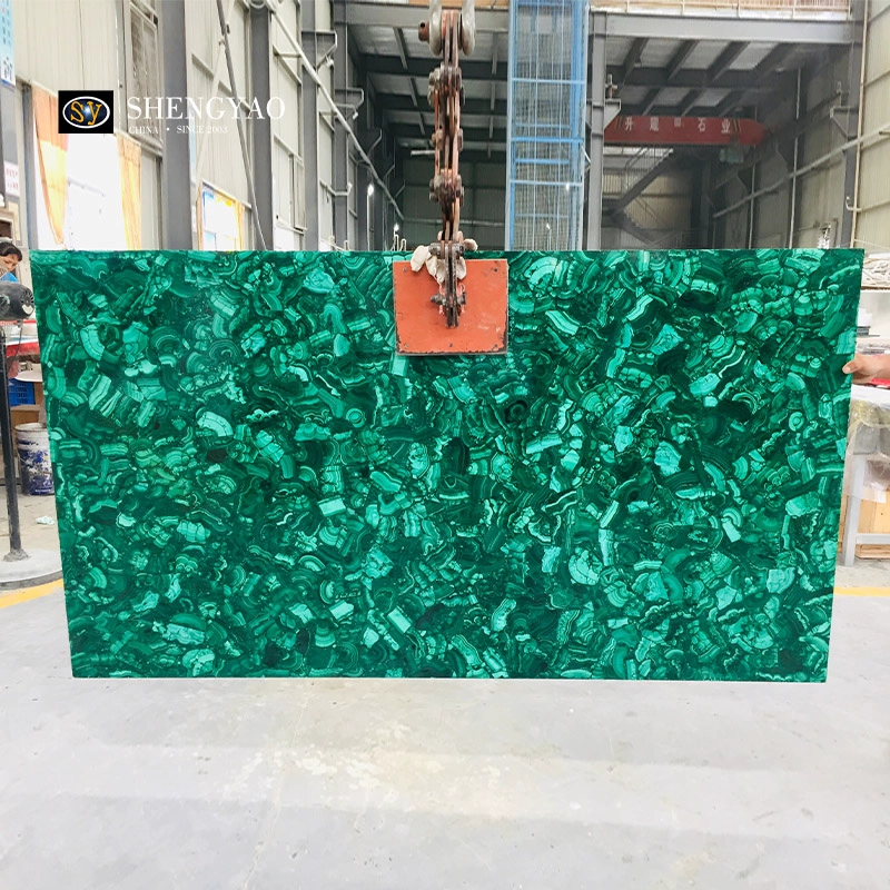 孔雀石板材是将天然孔雀石原石进行精选分级/切片处理/手工拼接(Mosaic Craft)/高压复合加固,最终形成可用于建筑与室内设计的大规格装饰面材。