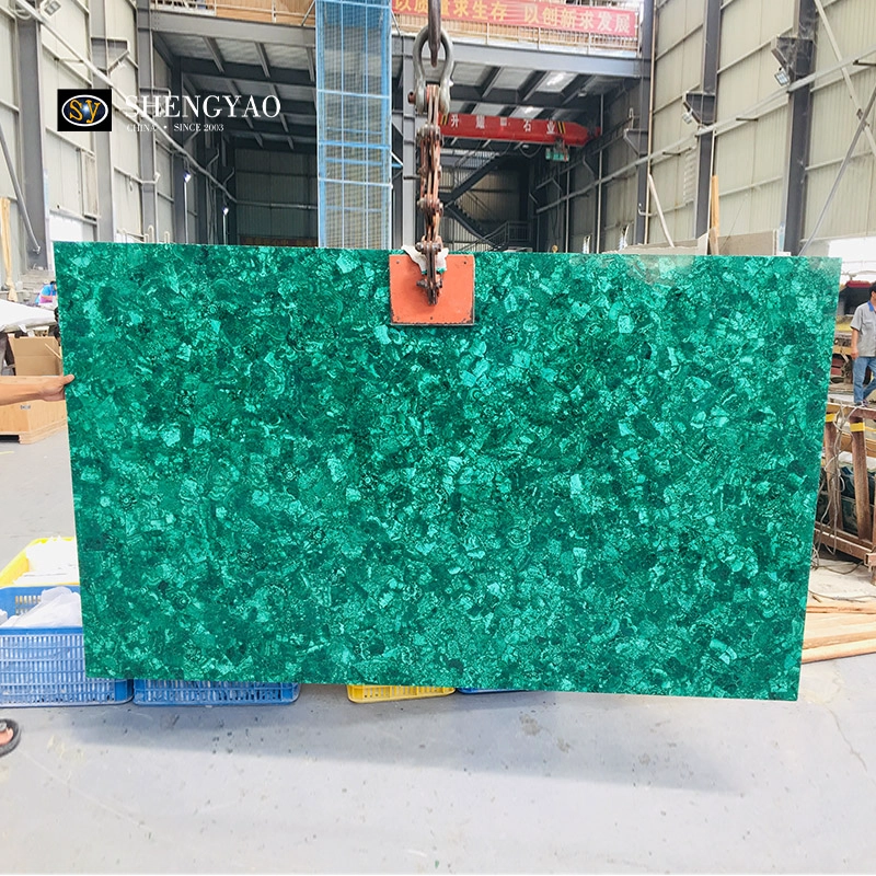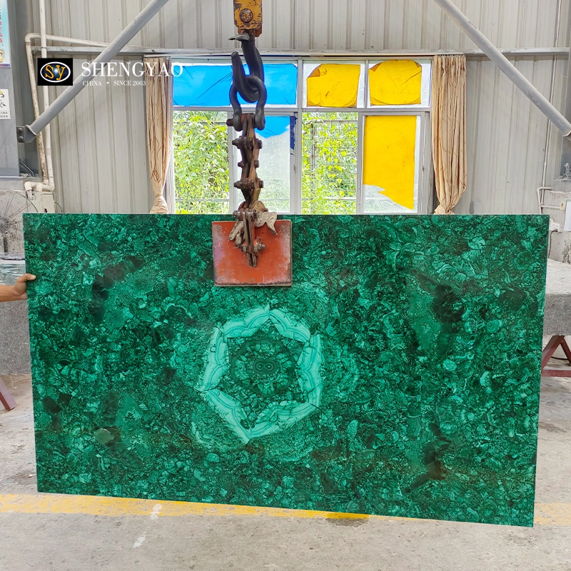 尽管孔雀石属于低透光材料,但通过合理灯光设计(如洗墙灯、重点射灯),可以显著增强其纹理层次与表面光泽,使绿色更加深邃、立体。
