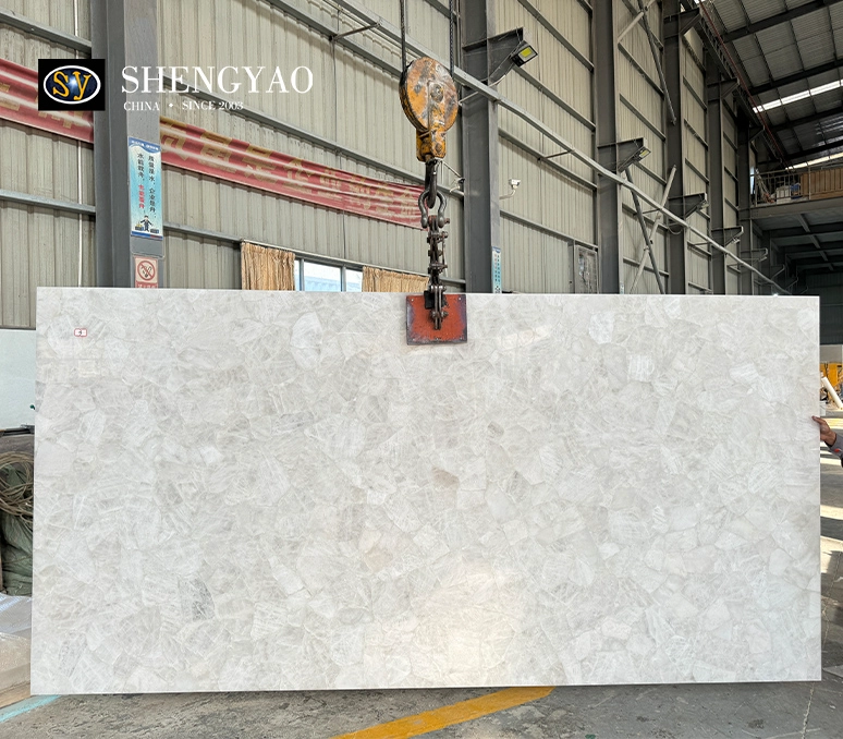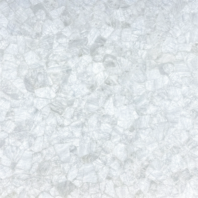 白水晶板材以“纯净、光感、通透”为核心视觉语言。在自然光或灯光作用下,晶体内部结构呈现出如冰裂、云雾般的层次变化,使空间产生轻盈且富有灵性的视觉体验。
