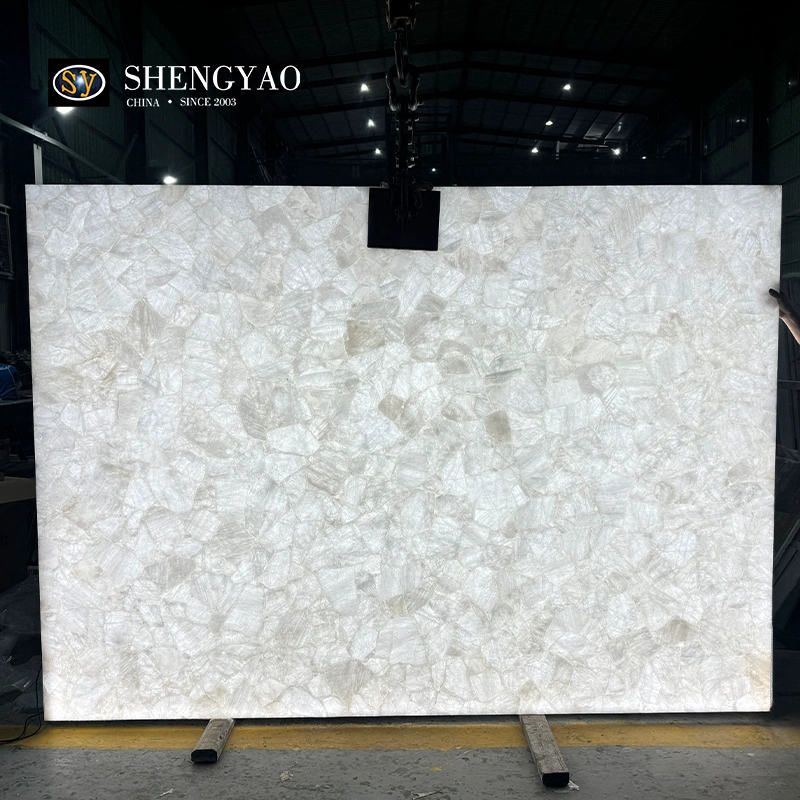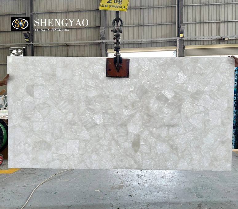 白水晶板是一款受流行的 半宝石板 材,具有良好的透光性能,有着纯净通透的质感。白水晶板材作为高端空间材料,不仅延续了天然宝石的能量与美感,更通过现代工艺转化为兼具艺术与实用价值的空间解决方案