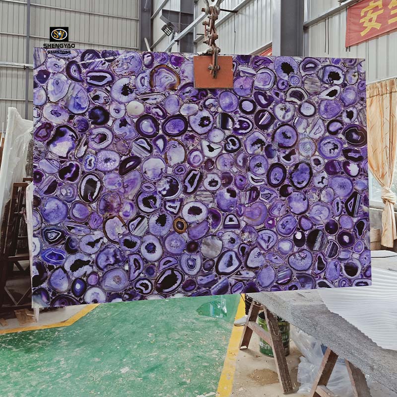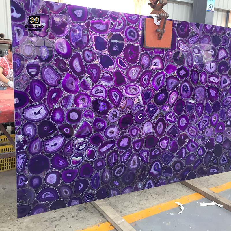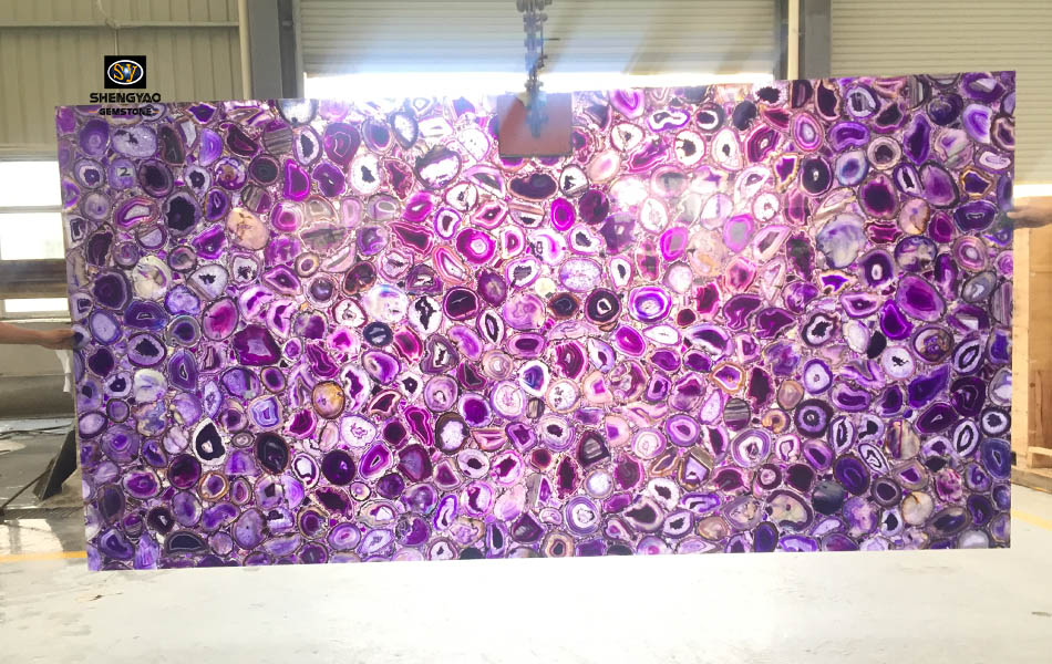 Die hintergrundbeleuchtete violette Achat-Halbedelsteinplatte hat eine gute Lichtdurchlässigkeit. Die hintergrundbeleuchtete violette Platte kann gut auf Dekorationen mit verschiedenen lichtdurchlässigen Effekten angewendet werden, z. B. Hintergrundwände, Bartheken und Böden.