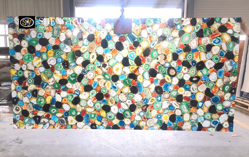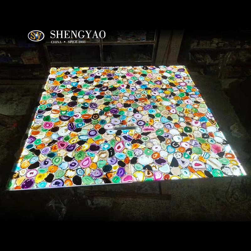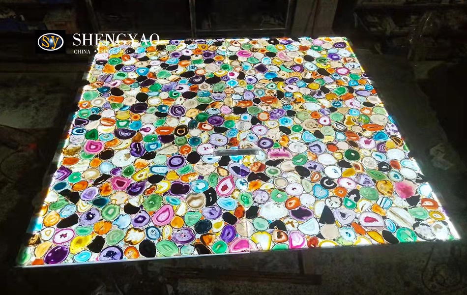 La lastra di agata mista retroilluminata è una lastra decorativa in pietra semipreziosa dai colori intensi. È fatto di agata blu, agata bianca, agata verde, agata rossa, agata viola, agata nera e agata di altri colori. Ha un effetto complessivo simile all'arcobaleno, che è un design innovativo. Utilizzato principalmente in pareti, pavimenti, mobili e altri luoghi.