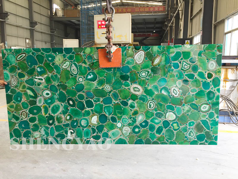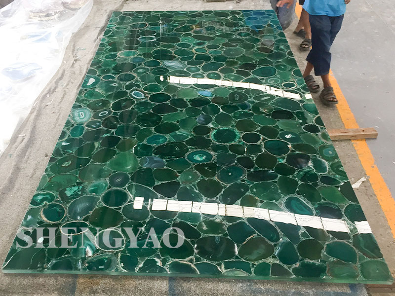 Il verde lastra d'agata è fatto di fette di agata naturale e la superficie adotta tecnologia di lucidatura ad alta resistenza, che è liscia e delicata. Poiché ogni pezzo di materia prima è naturale, l'intera lastra della pietra preziosa è unica. La consistenza unica è stata favorita da molti designer, ed è un'opera d'arte unica.