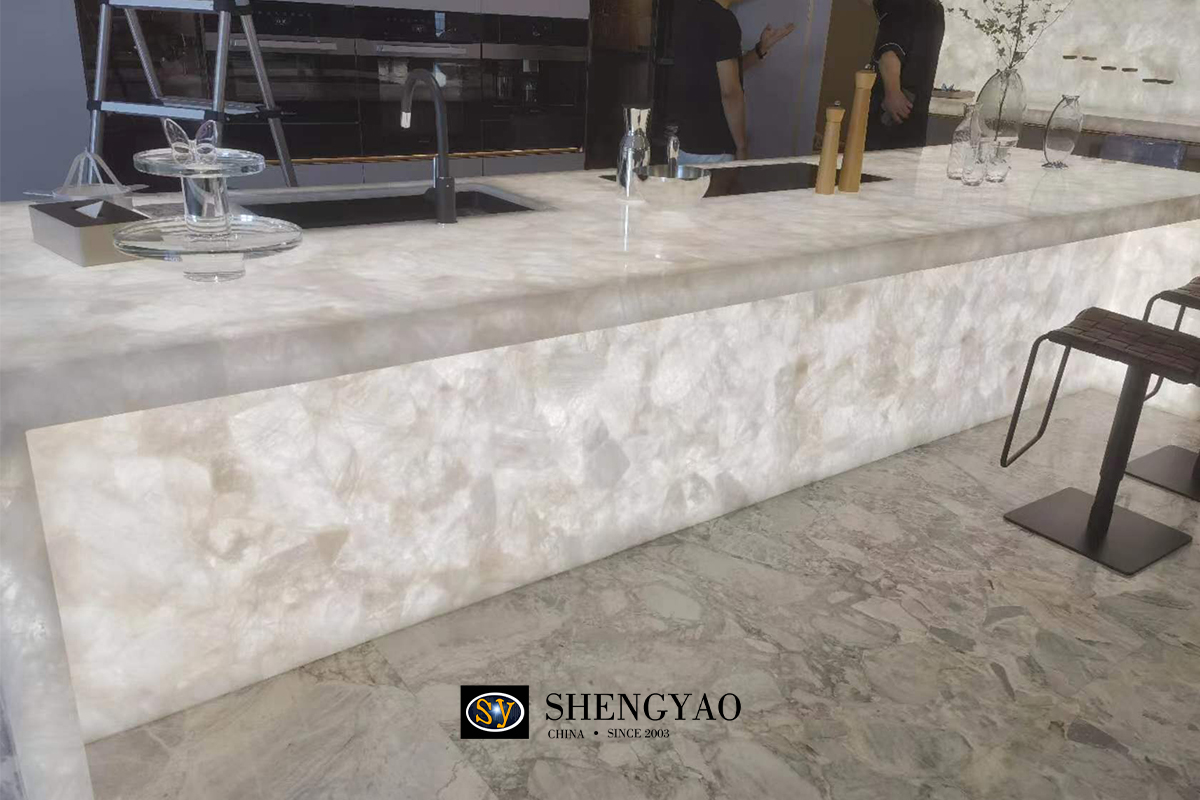 White quartz slab are very suitable as countertop materials for islands and bars. The light-transmitting feature will show a unique light effect under the illumination of light at night, making the island and bar become the focus area for family gatherings and leisure entertainment.