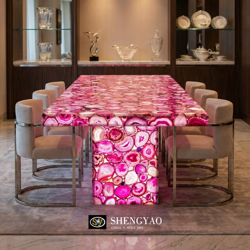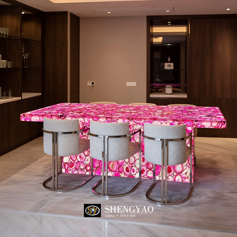 Pink agate backlit dining table is handcrafted from high-quality natural pink agate, meticulously pieced together by hand. The veining of each individual slab is entirely unique; when illuminated, the natural crystalline structure reveals a dreamy, translucent quality, transforming the tabletop from a mere functional surface into a captivating visual focal point within the space.