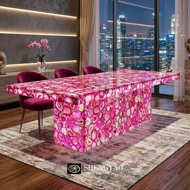 The translucent pink agate dining table, with its soft and luminous natural hues, transforms the accumulated passage of time within the mineral into a tangible warmth. As light penetrates the stone's internal grain, delicate layers of pink gently unfold amidst the interplay of light and shadow—much like the morning sun breaking through the clouds—evoking a sense of tenderness and vibrant vitality.